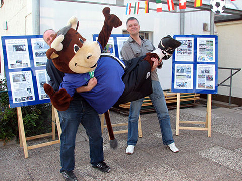 Zur 9. Cup-Veranstaltung war diesmal ein ganz besonderer Ehrengast eingeladen: Lohmann, das Maskottchen von Arminia Bielefeld. Ein witziger Stier im Arminen-Trikot, der wohl alle in seinen Bann zog. Er war permanent zu Späßen aufgelegt. So schnappte er sich gleich mal den Pokal und „entwendete“ kurzerhand eine komplette Torte. Er war überall gestikulierend dabei, denn reden kann (darf) er ja nicht. Natürlich ließ er sich auch gern fotographieren und durfte deshalb auch nicht auf dem offiziellen Pressefoto fehlen. Die Veranstaltung hat sich für den guten Zweck mal wieder richtig gelohnt. Insgesamt konnten nun schon über die Jahre mehr als 25.000,00 EUR für die Kinderklinik gesammelt werden.