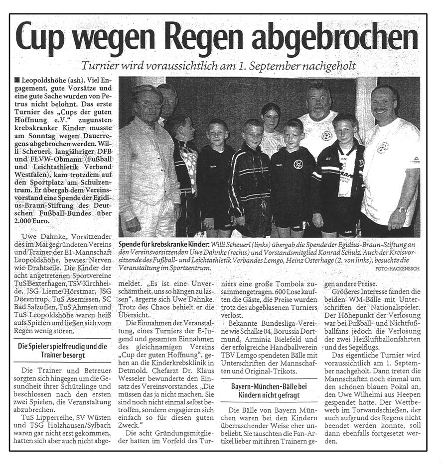 Einen Scheck über diese Summe konnte der Vereinsvorsitzende Uwe Dahnke noch im Dezember 2002 an die Kinderklinik Detmold, vertreten durch Frau Dr. Elisabeth Vallo, übergeben.