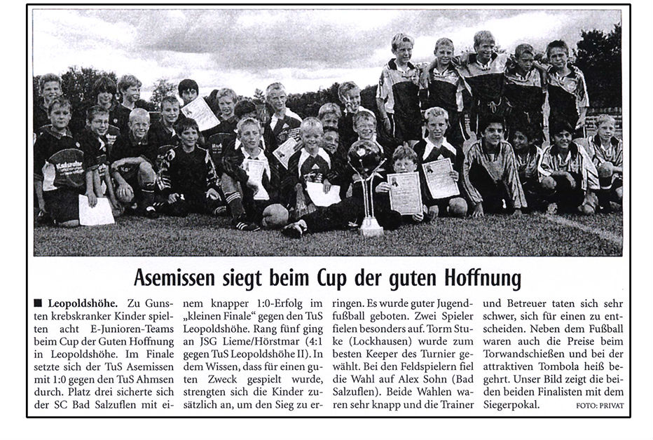 Nicht zuletzt auch durch diese großzügige Spende motiviert, verständigte man sich noch an diesm Tag auf einen neuen Termin, um das Event fortzusetzen. Denn schließlich konnte ja kein Sieger zur erstmaligen Vergabe des schönen Pokals ermittelt werden. So traf man sich knapp zwei Monate später wieder! Dabei setzte sich im Finale der TUS Asemissen mit 1:0 gegen den TUS Ahmsen durch und ging als erster Gewinner in die Vereinsgeschichte ein.