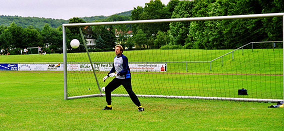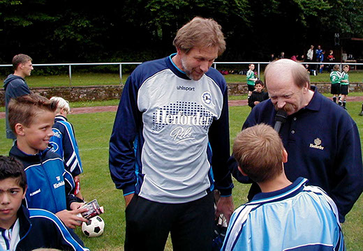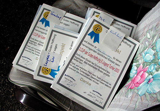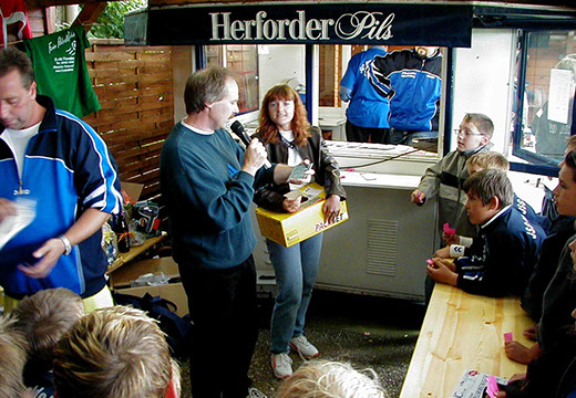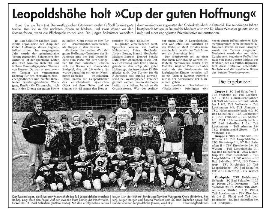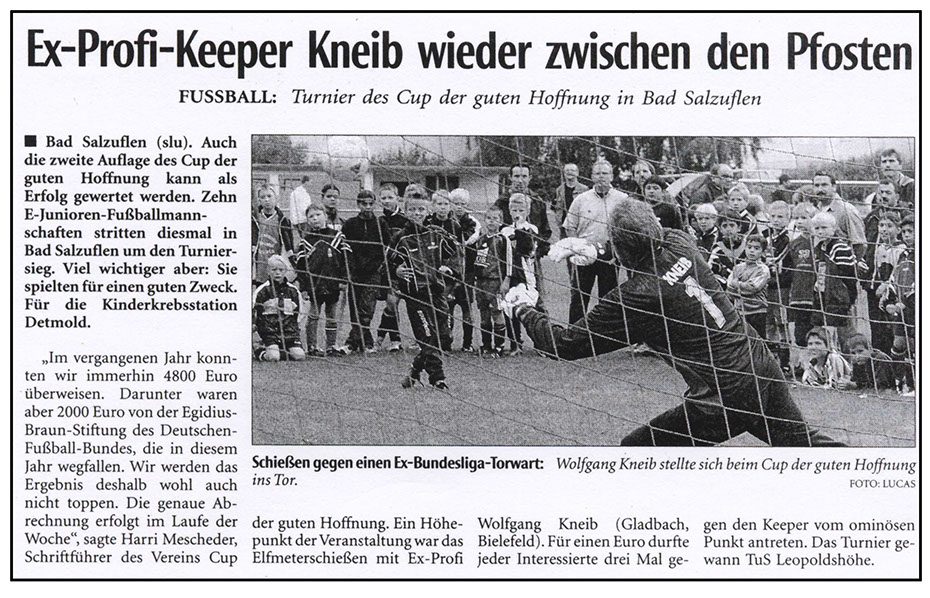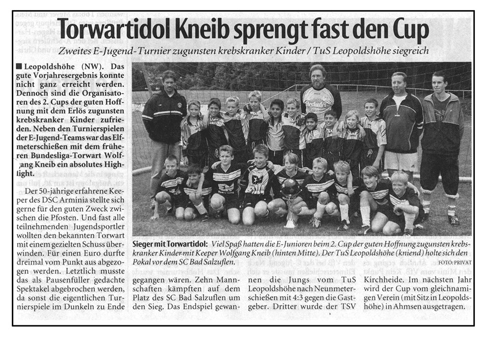 Für das zweite E-Jugendturnier konnte als Stargast der ehemalige Bundesligatorwart von Mönchengladbach und Arminia Bielefeld, Wolfgang Kneib, gewonnen werden. Da geriet das eigentliche Geschehen fast zur Nebensache. Der Ex-Keeper stellte sich erst Interviews und schließlich zum Elfmeterschießen wie abgesprochen "in den Kasten". Die Chance, für einen Euro pro drei Schuß gegen einen renomierten ehemaligen Profi-Torhüter anzutreten, wollte sich kaum jemand entgehen lassen. Der Andrang war riesig und das eigentlich als Pausenfüller angesetzte Highlight mußte schließlich zwangsweise beendet werden; die Kinder und Jugendlichen hätten sonst wohl noch bis tief in die Nacht Elfmeter getreten. Das eigentliche Turnier entschieden diesmal die Leopoldshöher für sich. Sie siegten mit 4:3 im Neunmeterschießen gegen den Gastgeber SC Bad Salzuflen. Finanziell war das Ergebnis des Vorjahres natürlich nicht zu toppen. Für den guten Zweck kamen diesmal aber immerhin 1.300 Euro zusammen, die im April des Folgejahres an Dr. Hans Broede der Kinderklinik Detmold übergeben wurden. Verwendet werden soll der Betrag für eine professionelle Kaffeemaschine, um den Angehörigen auf der Krebsstation den Aufenthalt angenehmer zu gestalten. Übliche Budgets können dafür nicht herangezogen werden!