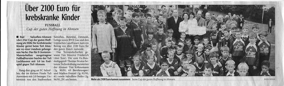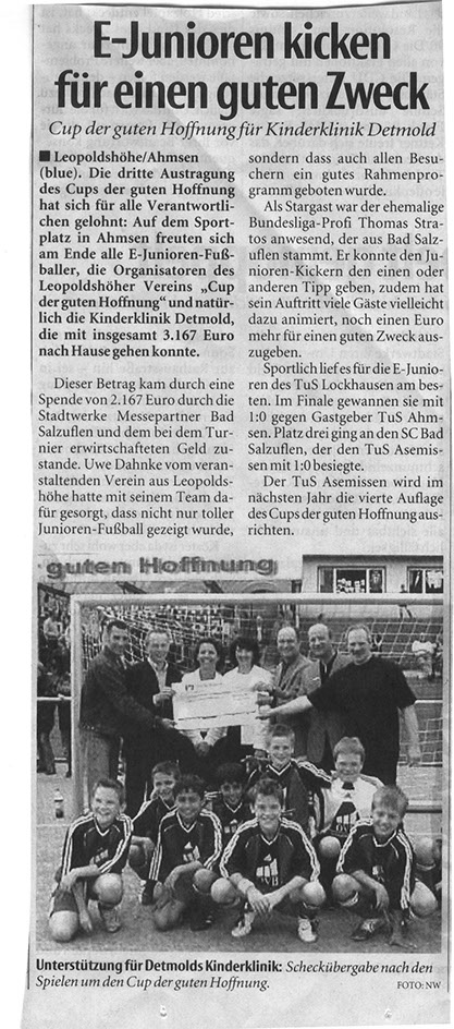 Die dritte Austragung eines E-Jugendturniers zugunsten krebskranker Kinder hatte sich für alle Beteiligten so richtig gelohnt. Die Kicker des TuS Lockhausen freuten sich über ihren Pokalgewinn im 1:0 Endspielsieg gegen Gastgeber TuS Ahmsen, die übrigen Kinder über die obligatorischen Urkunden und der Cup der guten Hoffnung verzeichnete eine Rekordeinnahme für den guten Zweck von letztendlich über mehr als 4.000 Euro. Da konnte man es schon verschmerzen, dass der als Top-Stargast angekündigte ehemalige Bundesligaprofi und Europameister Stefan Kunz leider doch nicht erschienen war. Um so mehr freute man sich über die Präsenz eines anderen Ex-Profis: Thomas Stratos! Dieser beschäftigte sich viel mit den Jugendlichen und bewies sein Können beim "Ballhochhalten". Die Kiddies eiferten ihm begeistert nach; doch seine Bestmarke blieb natürlich unerreicht. Abgerundet wurde das Programm neben dem sportlichen Teil mit einer tollen Tombola, dem Zauberer Siggi Socke und Tanzeinlagen der Mädchentruppe des TuS Ahmsen. Der stolze Spendenbetrag kam übrigens durch die Stadtwerke Messepartner, die Turniereinnahmen und sonstige Spenden zustande. Die Stadtwerkeeinrichtungen aus Bielefeld, Lemgo, Detmold und Bad Salzuflen hatten im Frühjahr bei der Messe "Haus" zusammen mit der RWE einen Messestand; gespendet wurden jetzt Einnahmen vom Pickertessen der lippischen Landfrauen, stolze 2.160 Euro. Diesmal soll der Betrag in die Zimmerausstattung (Kinderspielzimmer) fließen.