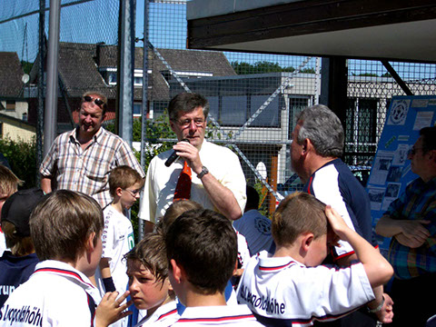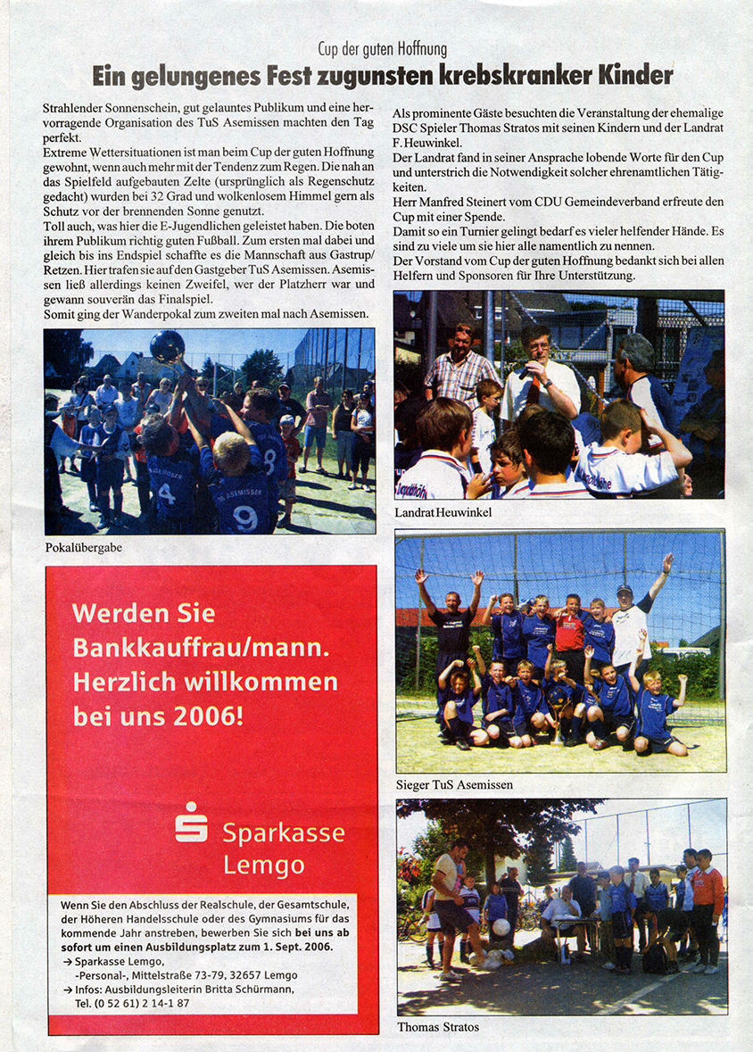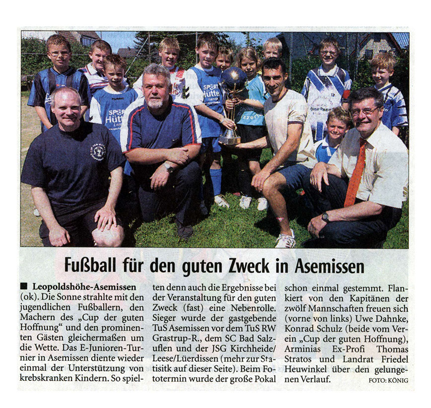 Der Wettergott meinte es diesmal fast schon zu gut mit dem Cup der guten Hoffnung und auch in der Politik hat sich das Engagement des Cups der guten Hoffnung zwischenzeitlich rumgesprochen. So erschien bei allerbestem, sehr heißem Wetter der Landrat F. Heuwinkel und fand in seiner Ansprache nur lobende Worte für das Engagement des wohltätigen Vereins und betonte die Notwendigkeit ehrenamtlicher Tätigkeiten. Wie schon letztes Jahr besuchte auch wieder der ehemalige Libero des DSC Arminia Bielefeld, Thomas Stratos, die Veranstaltung und gab erneut technische Kabinettstückchen zum besten. Auf dem Platz war dagegen die Leistung der Jugendlichen angesichts der Hitze beeindruckend. Durchsetzen konnte sich hier der Gastgeber TuS Asemissen gegen die Debütanten vom TuS RW Grastrup/Retzen. Der Wanderpokal ging somit nun schon zum zweiten Mal an die Asemisser! Zu Bewundern gab es übrigens noch ein Extraspiel: Angetreten war eine Jugendauswahlmannschaft vom Kreis Lemgo. Gespendet wurde selbstverständlich auch; unter anderem vom CDU-Gemeindeverband. Mit dem Ergebnis zugunsten der Kinderklinik waren die Verantwortlichen wieder einmal sehr zufrieden.