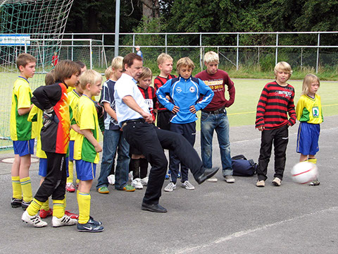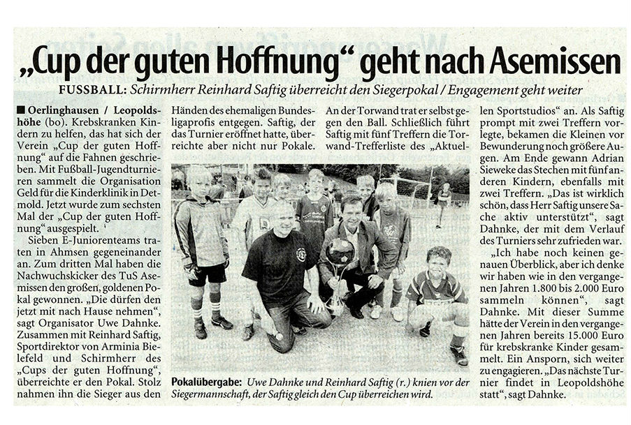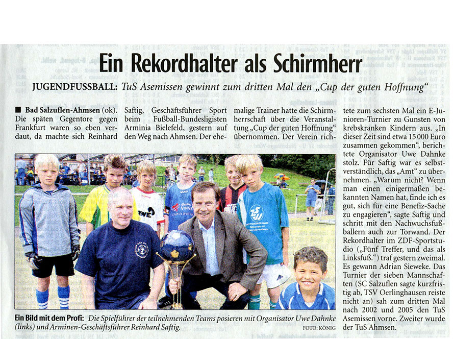 Zum zweiten mal hieß der Austragungsort Ahmsen und erneut fand dort ein gut organisiertes, überaus erfolgreiches Turnier statt. Eröffnet wurde es durch den neuen Schirmherrn Reinhard Saftig, Manager von Arminia Bielefeld. Dieser beließ es aber nicht bei der Ansprache, sondern engagierte sich zur Freude der Kinder auch an der Torwand. Als noch immer amtierender Rekordhalter an der Torwand des aktuellen Sportstudios mit fünf (!) Treffern legte er auch in Ahmsen mit zwei Treffern vor. Auch der Turniersieger stellte einen neuen Rekord auf. Denn nach 2002 und 2005 gewann der TuS Asemissen den Pokal zum dritten Mal und darf ihn nun behalten. Im nächsten Jahr in Leopoldshöhe wird ein neuer Pokal präsentiert. Ein neuer Rekord konnte auch bezüglich der Spendeneinnahmen vermeldet werden. Sage und schreibe gut 5.000 Euro wurden eingenommen und per Scheck im März 2008 dem Oberarzt und Leiter der Kinder- und Jugendmedizin, Dr. Hans Broede, übergeben. Diese bislang höchste Spendensumme erreicht die Kinderklinik zur rechten Zeit. Denn es steht der Umzug in einen Neubau bevor; entsprechend besteht in Kürze Bedarf an Neuanschaffungen und kindgerechten Zimmerausgestaltungen.