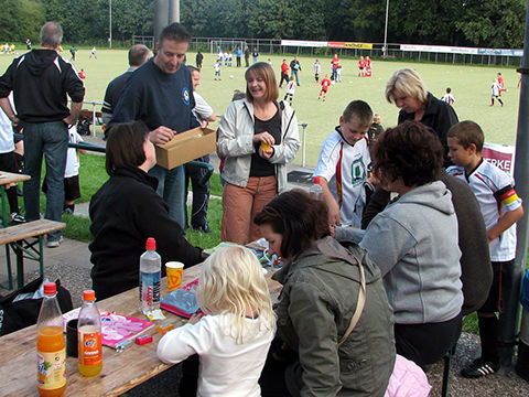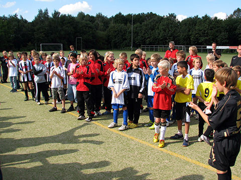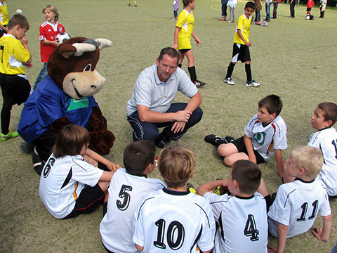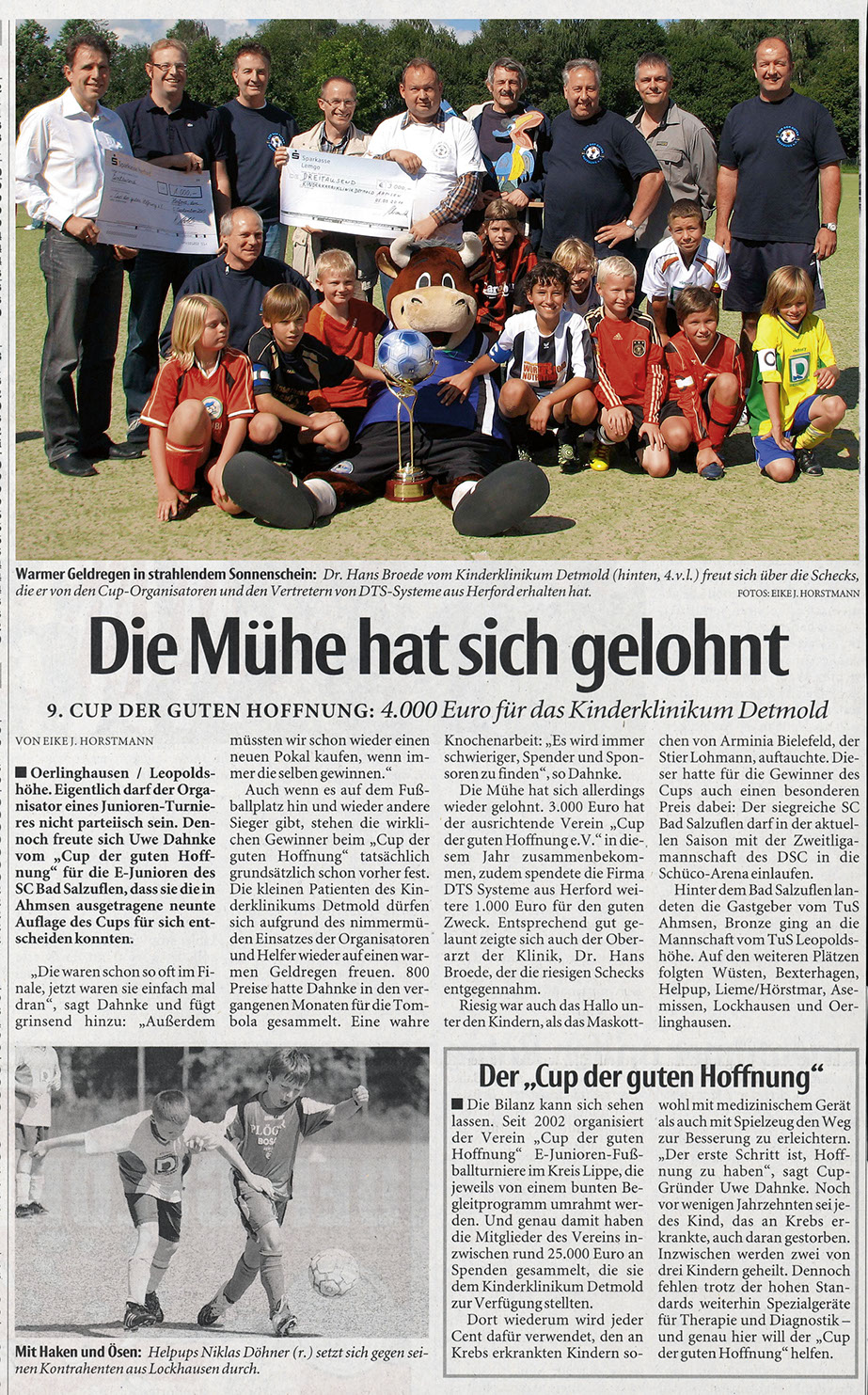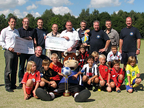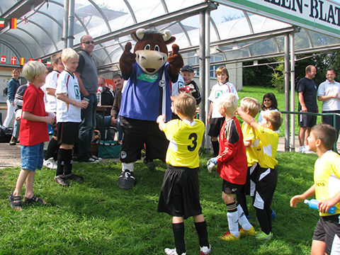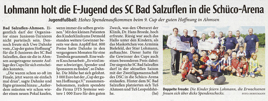 Zur 9. Cup-Veranstaltung war diesmal ein ganz besonderer Ehrengast eingeladen: Lohmann, das Maskottchen von Arminia Bielefeld. Ein witziger Stier im Arminen-Trikot, der wohl alle in seinen Bann zog. Er war permanent zu Späßen aufgelegt. So schnappte er sich gleich mal den Pokal und „entwendete“ kurzerhand eine komplette Torte. Er war überall gestikulierend dabei, denn reden kann (darf) er ja nicht. Natürlich ließ er sich auch gern fotographieren und durfte deshalb auch nicht auf dem offiziellen Pressefoto fehlen. Die Veranstaltung hat sich für den guten Zweck mal wieder richtig gelohnt. Insgesamt konnten nun schon über die Jahre mehr als 25.000,00 EUR für die Kinderklinik gesammelt werden.