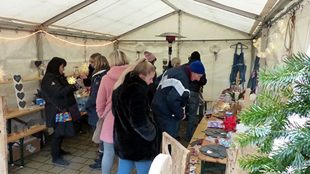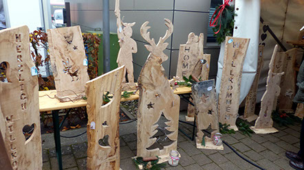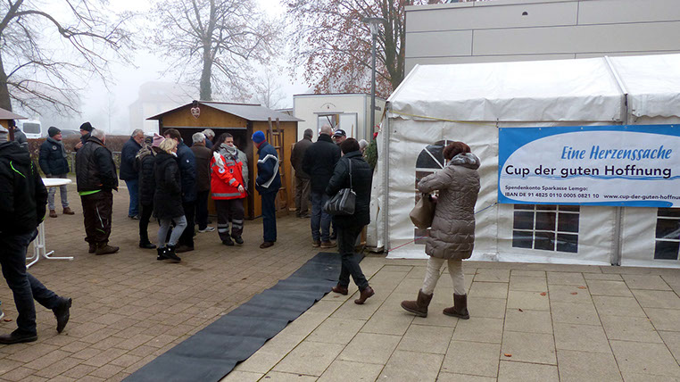 Wir vom Cup der guten Hoffnung waren in einer von Frau Druffel (Blumenhaus Kerker) weihnachtlich dekorierten „Bude“ vertreten, wo für den guten Zweck „Lose ohne Nieten“ gekauft werden konnten. Die 150 Lose waren recht schnell aus-verkauft! Im daneben liegenden Zelt wurden selbst gebastelte, weihnachtliche Artikel verkauft. Der Dachdeckermeister Ernst Relzow aus Lage-Pottenhausen hatte wieder keine Kosten und Mühen gescheut und mit seinen Mitarbeitern tolle Holzskulpturen angefertigt, die für den guten Zweck verkauft wurden und wahrlich reißenden Absatz fanden.